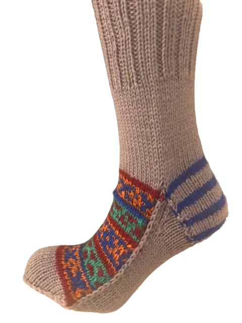 Beige Base with Horizontal Purple Lines on Heel - hand knit woollen socks